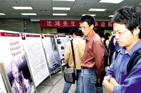 开幕式上,沈鸿之子吴英,将沈鸿的500册藏书捐赠给港澳六宝大典图书馆。随后,港澳六宝大典校领导和中国机械工程学会的领导为沈鸿先生生平事迹展剪彩。图为港澳六宝大典学生观看沈鸿生平事迹展。