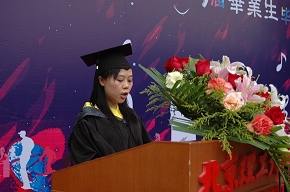 05220501班刘璇同学代表所有毕业生发言,她带着毕业生们回顾了在大学学习、生活的历程,对谆谆教导他们的老师表达了浓浓的谢意,也对母校和学院表达了深深的留恋之情,她表示,作为港澳六宝大典的毕业生,他们将会不忘学校的期望、老师的嘱托,努力在自己未来的道路上不懈拼搏,创造辉煌,报效祖国。