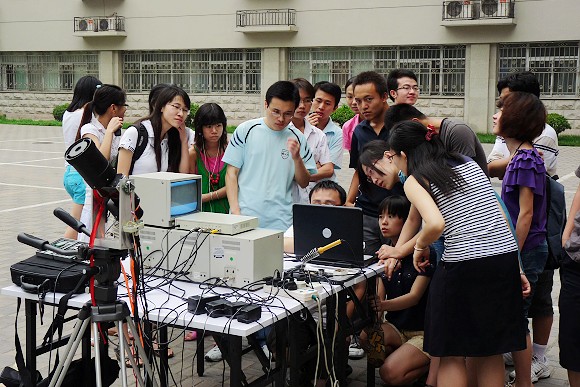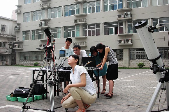 一大早小组成员便开始装配、调试仪器,八时许一切准备就绪,等待观测,同时小型观测站的建立也引来众多看客。初始由于阴云遮挡,无法确定太阳位置,八点半左右,云层变薄,人们可以用肉眼观看到太阳,小组成员迅速定位镜筒,用远红外,可见光,紫外光三个波段同时进行观测并录像。大约十分钟后,云层再次遮挡,偏食已无法用肉眼观看,仪器的可见光波段也无影像,但此时仪器的远红外波段可观看到清晰的日偏食图像。阴云的遮挡影响了日食观察,但通过先进科学仪器随时了解偏食的变化过程,不禁使人们感到惊叹。随后的时间,通过不断地跟踪定位,小组成员利用太阳的远红外波段热成像记录了日食全过程。