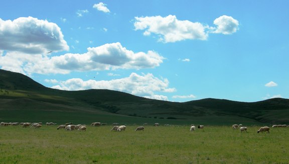 “蓝蓝的天上白云飘,风吹草低现牛羊”
