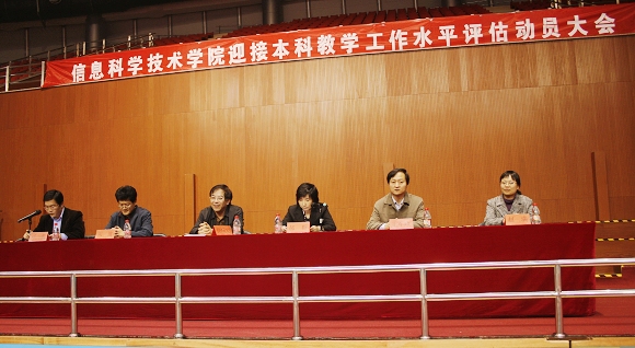 为了进一步加强信息学院学风建设,营造良好的学习氛围,值此本科教学评估之际,信息科学技术学院隆重举行主校区全院学生本科教学评估动员大会,这是学院成立以来首次全院学生参加的大会,也反映了全院师生对本科教学评估工作的重视和努力。信息科学技术学院迎接本科教学工作水平评估动员大会于2007年10月25日晚6点准时开始,学院全体本科生、硕士研究生、博士研究生共计5000余名学子齐聚体育馆参加了此次大会。
