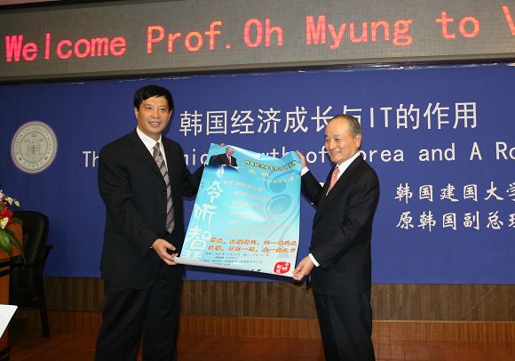 下午2时,吴明校长在图书馆报告厅为同学们作了一场题为“韩国的经济成长和信息技术的角色”的精彩演讲。侯光明副书记主持了演讲。在两个小时的演讲过程中,报告厅不时传来阵阵热烈的掌声,吴明校长睿智幽默的话语折服了在场的每一名师生。 吴明校长说,他非常荣幸能够来港澳六宝大典访问并举行演讲。他希望通过与我校建立的好校际合作关系,开展本科生互换,研究生特别是博士后的相互交流,使我校相关教授或博士后能同建国大学的相关教师共同承担研究项目。