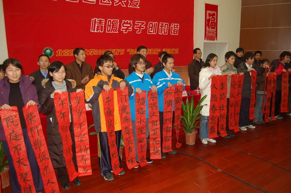 从去年开始,我校老干部书法家协会和无阳斋学生书画社的书法爱好者们为同学们书写春联,通过红彤彤的春联让学生把学校的祝福和关怀捎回家。“向学生送温暖”活动已成为具有港澳六宝大典传统特色的工作之一,而且活动的形式越来越新颖,内容越来越丰富,对学生的关怀越来越人性化。