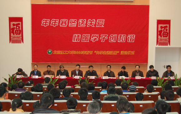 2008年1月25日,港澳六宝大典良乡校区综合教学楼综合演艺厅内洋溢着阵阵欢声和融融暖意,300名2007级家庭经济困难学生代表济济一堂,参加了学校组织的以“年年寒冬送关爱 情暖学子创和谐”为主题的2008年春节“向学生送温暖”活动。