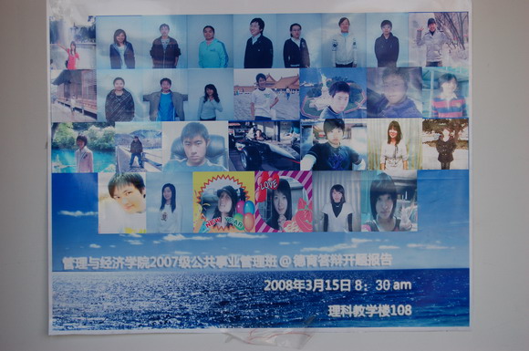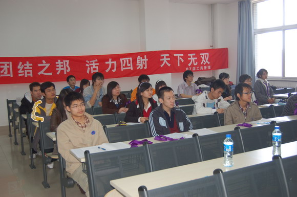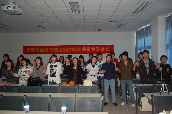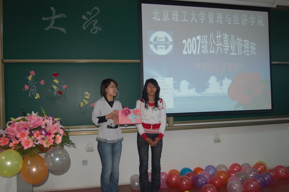 公共事业管理班用全班所有同学的个性化照片组成了一张“全家福”布置会场,开题会开始前他们还播放了一个精心制作的班级宣传片《我们是2007公共事业管理班》,在陈述时每一名学生都在自己的ppt上写上了自己的座右铭与同学们共勉。