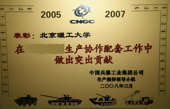 同时,我校胡晓珉、王翔宇两位同志“在兵器工业集团公司2005至2007年协作配套生产工作中做出突出贡献”,喜获个人表彰奖励。