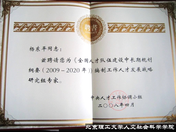 最近,中央人才工作协调小组从国家有关部委、社科院、大学聘请28名专家,参与《全国人才建设中长期规划纲要》编制工作。我校人文社科学学院教育科学研究所所长杨东平教授被聘为人才发展战略研究组专家。4月25日,中央人才工作协调小组组长李源潮同志为专家颁发证书,并与人才发展战略研究组的6位专家进行了座谈。