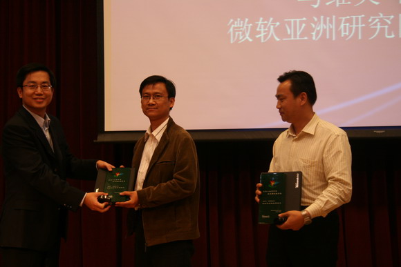 马维英博士在演讲前,还代表微软技术俱乐部,为俱乐部的指导教师陈旵明老师、金旭亮老师颁发聘书,并感谢计算机学院领导与老师对微软技术俱乐部的支持。