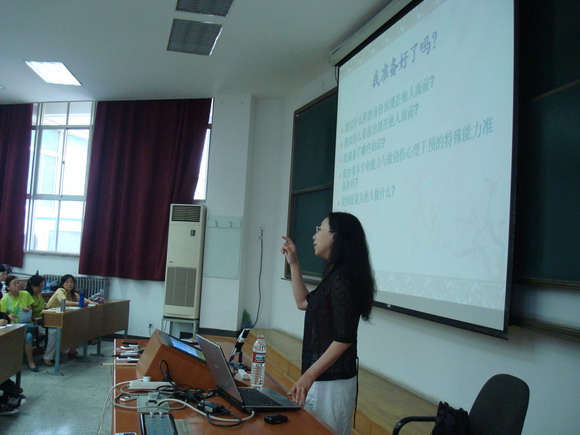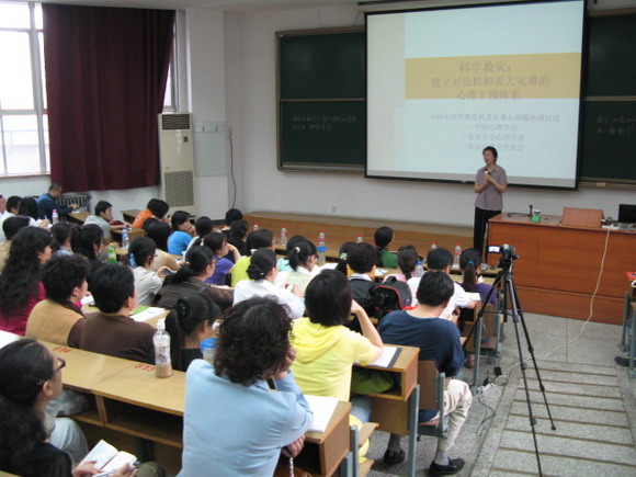 培训首先由项目组组长、北京大学心理学系钱铭怡教授介绍了中国心理学界心理援助的体系和整体工作思路,也指出在心理援助中需要总结的经验和克服的问题。我校人文学院的贾晓明教授讲授了如何进行灾后心理干预的个别及小组心理干预方法。项目组的其他一些专家讲授了创伤理论,灾后儿童心理创伤的干预。培训结束时,项目组派出的,到四川从事培训和心理干预并已回京的专家介绍了前线的情况和感受。