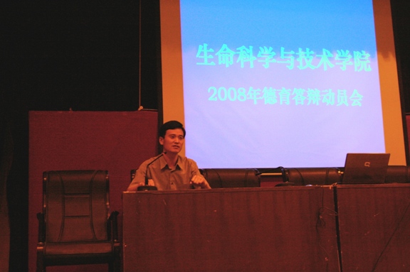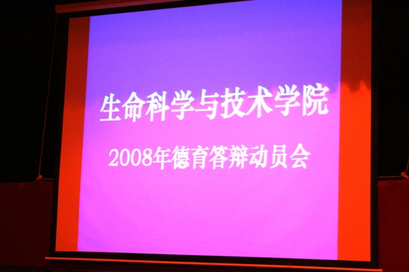 5月22日,在七号楼报告厅,生命学院学生工作组组织全体2004级应届本科毕业同学参加的德育答辩工作动员大会,就今年毕业工作和德育答辩工作的相关精神和安排作出了动员和布置,特别希望广大同学在关心关注汶川地震的同时,也能联系自己的大学的四年生活,用“关爱生命,珍视记忆”的积极心态,回顾总结自己四年的大学生活。