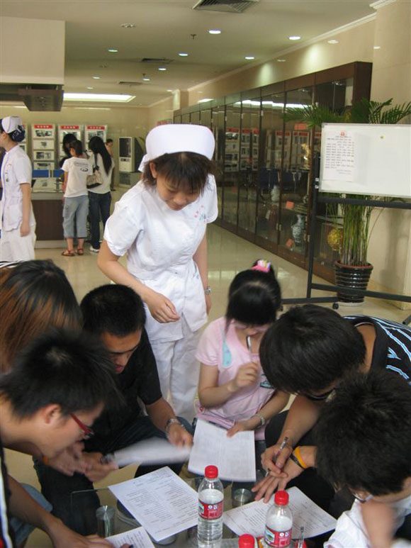 5月23日早上,载有50多名志愿者的校车驶向北京红十字会血液中心,在几名骨干志愿者的组织下统计人数、填表、体检、献血、集合休息。