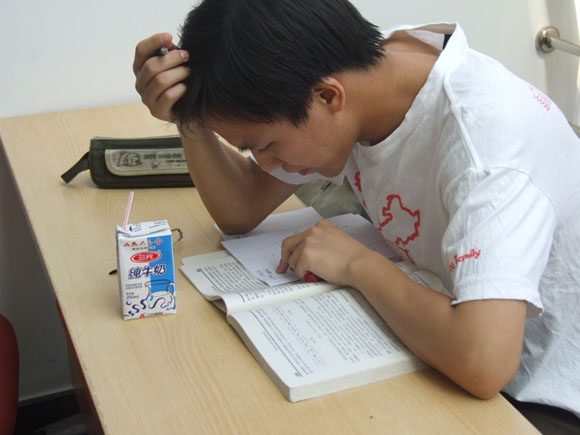 由于临近期末考试,一些同学利用等候献血的时间,抓紧复习功课。