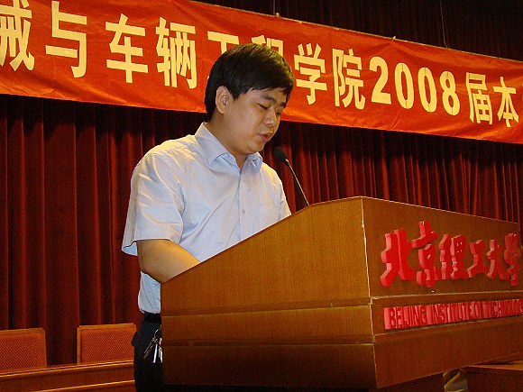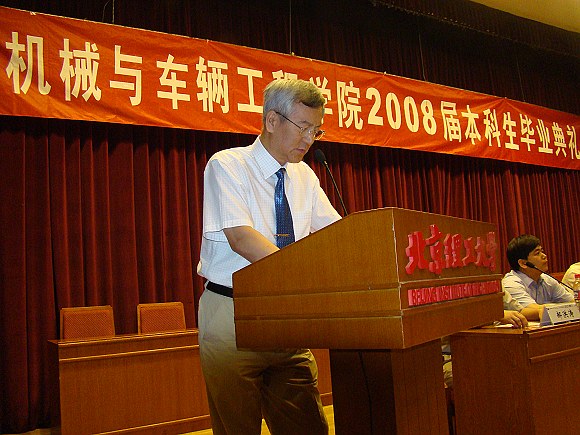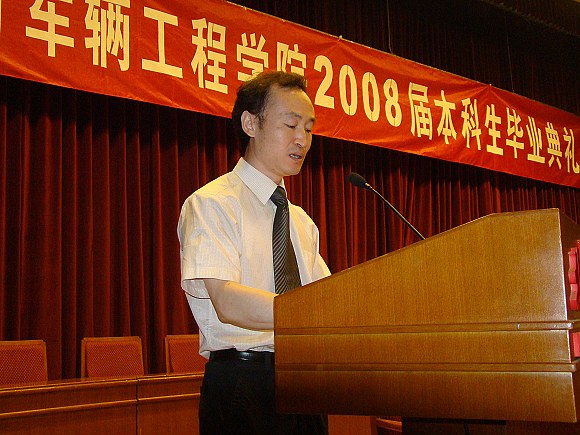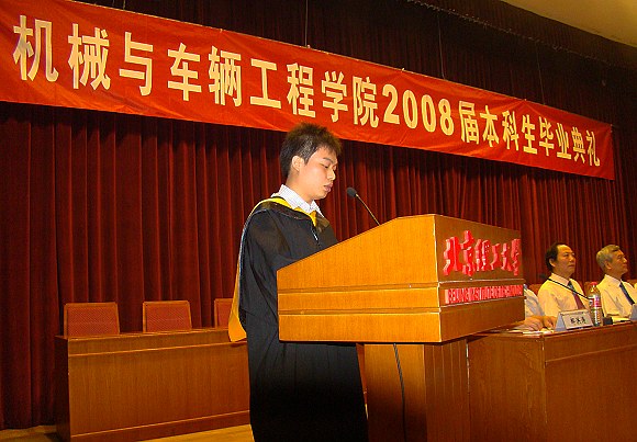 学生代表栗鹏同学代表全体2008届毕业生发言:四年前,不同的际遇、不同的生活、不同的理想让我们走到一起,走进机械与车辆工程学院,分别的时候,衷心祝愿大家有同样成功的事业,同样灿烂的未来,同样精彩的人生。感谢学校、学院为我们搭建了这么好的学习、发展的平台,感谢学院所有老师们对我们的培养和爱护。祝所有的同学在新的人生路途上,一路顺风。
