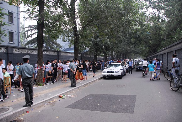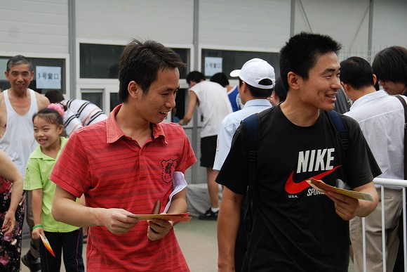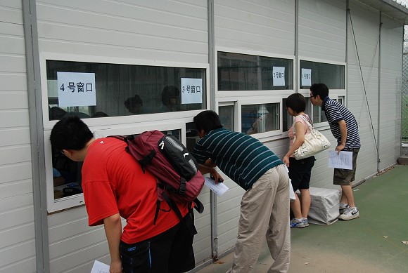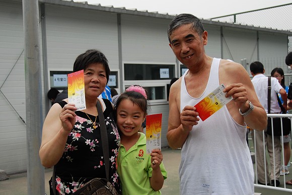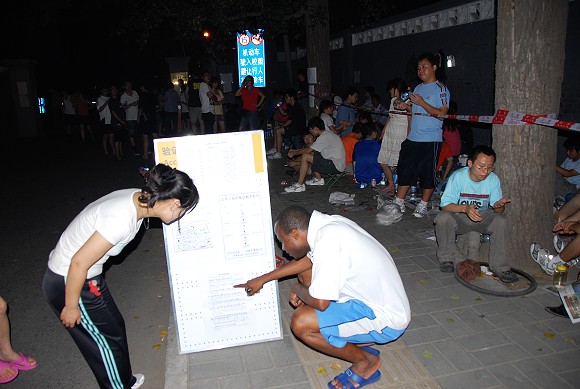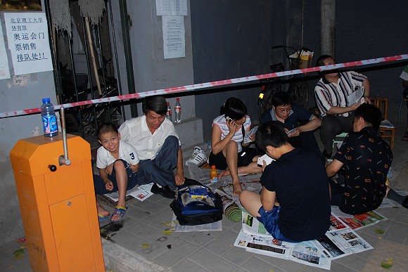 按照奥组委的统一安排,7月25日起,北京2008年奥运会最后的82万余张体育比赛门票开始通过场馆售票亭面向公众发售。从23日开始,一些场馆的售票点前就开始有购票者排队等候了。24下午开始,港澳六宝大典东侧门外也已经排起了购票长龙,队伍沿着小东门外小路的北墙一直向东延伸,几乎排到了中关村大街。排在第一位的是一个看上去还没有上学的小朋友,他跟着舅舅下午2点就来排队了,他最想买有中国男排那一场的比赛门票。