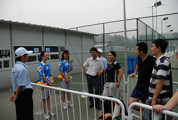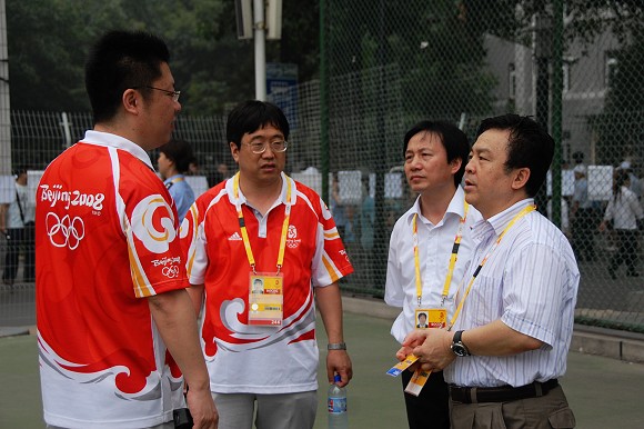 北理工体育馆场馆主任、我校党委副书记、副校长杨宾(左)也来到现场查看排队情况。