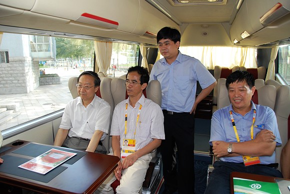 孙逢春副校长在向李毅中部长介绍纯电动大客车的环保优势和特性,李毅中部长对电动大客车的舒适度和运行情况表示非常满意。