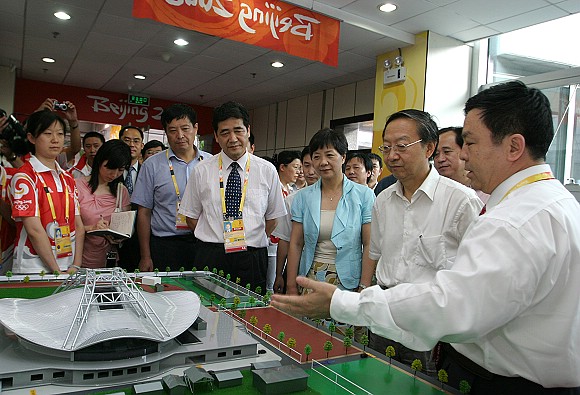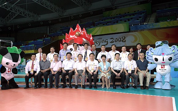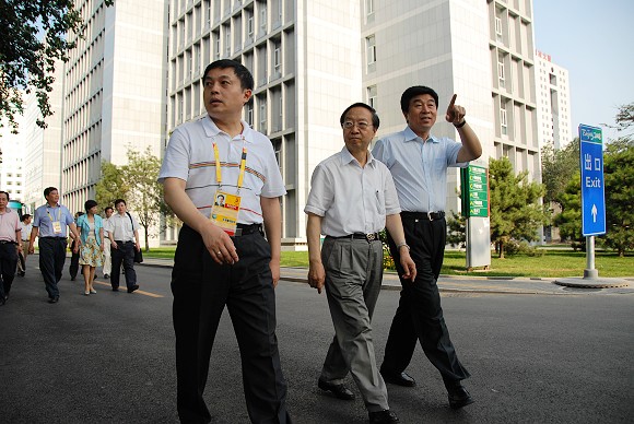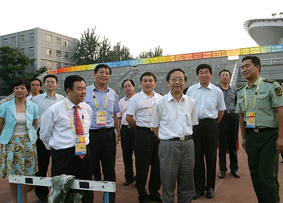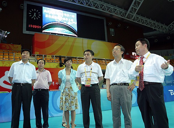 李毅中部长一行来到奥运场馆排球比赛场地检查指导工作。