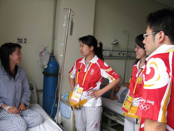 志愿者们没有一刻忘记过善良可亲的小莹,听到她住院治疗的消息,大家对她的病情都十分担心。衡老师、沙老师一行代表场馆和志愿者们立即前往海淀医院看望她,为她带去志愿者大家庭的问候,同时还带去了为她精心准备了新鲜水果和牛奶,她的好朋友志愿者李珍与苗娟以及运行支持小组专门为她画的极其可爱的漫画,这一切都令小莹十分感动。志愿者经理沙老师也给小莹带来了惊喜------一条新版的志愿者微笑圈,这些礼物代表了我们所有志愿者的问候,祝愿小莹早日康复,尽快回到我们这个大家庭。