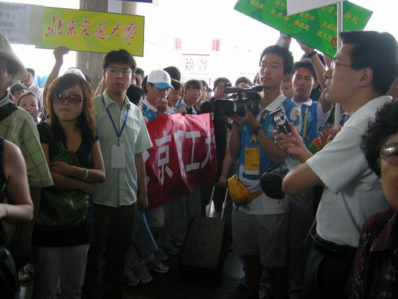 出站口站满了来自各个高校的接待团体,大家都用最热情的行动,用最真诚的微笑来期盼着香港志愿者的到来。