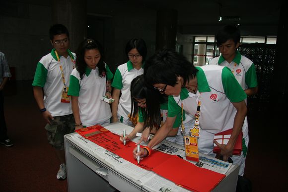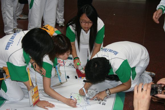 所有的澳门志愿者在一幅长达20.08米的,名为“同一个世界,同一个梦想”的画卷上签下了自己的名字。