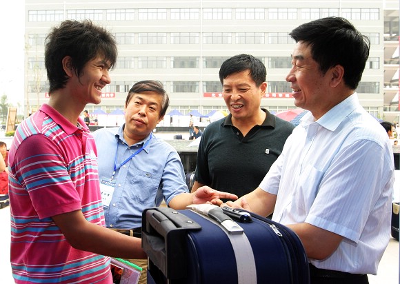 在绿色通道前,党委书记郭大成(右)与新生进行了亲切的交谈,询问他们的家庭情况,并代表学校给贫困学生发送了“大礼包”。