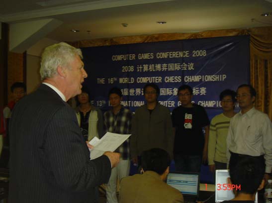 国际计算机博弈竞赛委员会主任Van Der Heric先生向队员们颁发奖牌
