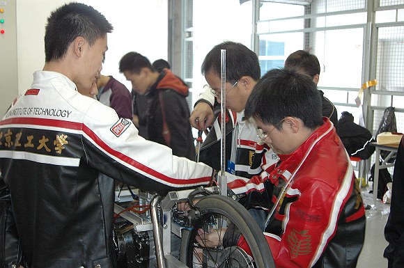 比赛的结果令人欣慰,比赛的过程却异常坎坷,16日,预赛成绩比较理想,比赛进行的很顺利。可是,17日,一切发生在预料之外,捷豹车队节能车的电池突然坏了,备用的电池经过早上的使用也快没电了,试行赛后,经改造后的发动机活塞、火花塞也坏了,离比赛还有半小时,所有人认为捷豹车队已经不可能重返赛场。可是,我校学生“不抛弃,不放弃”,以良好的心态发扬团队精神,明细分工,在比赛前借来了电池、火花塞,经过拆卸发动机更换活塞和火花塞之后。终于在发车时间结束前一分钟到达发车线,令在场的其他代表队瞠目结舌。在比赛过程中,我校学生充分展示了北理工学子扎实的专业功底、良好的实践技能、优秀的综合素质,博得了其他参赛队的一致好评。