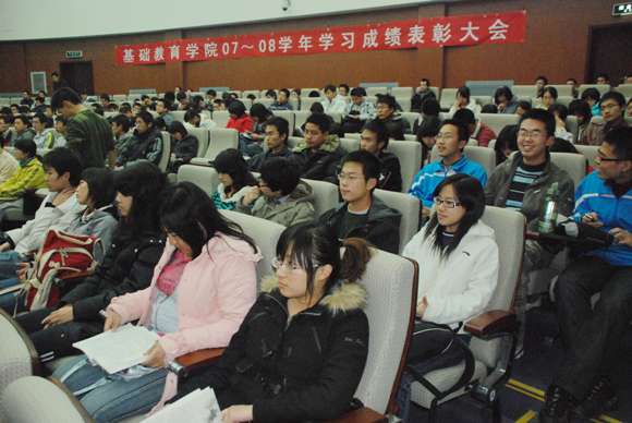为表彰07-08学年第二学期取得优秀学习成绩的班级和个人,营造更加浓厚的学习氛围,促进优良学风的建设,基础教育学院于11月24晚在综合楼报告厅举办了07-08学年第二学期学习成绩表彰大会。港澳六宝大典副校长、基础教育学院院长李和章,教务处副处长韩宝玲,学生工作处副处长娄秀红,基础教育学院党委书记、常务副院长王悦音,基础教育学院副院长郭彦懿、杨刚、朱光辉,以及全体专职学生工作干部和07级、08级学生代表出席了表彰大会。