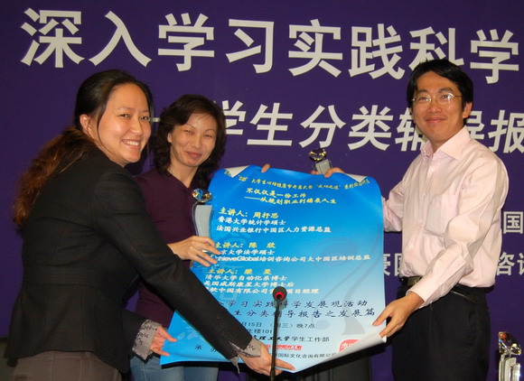 为了帮助培养我校学生在大学期间形成良好的职业规划意识,引导学生科学地规划大学时期的学习、生活,学生工作部于4月15日晚7时在研究生楼101报告厅举办了第36期“聆听智慧”名家论坛讲座,同时也是第九届“5•25”大学生心理健康节开幕式暨“成功之道”系列校园讲座。法国兴业银行中国区人力资源总监周抒思、前AchieveGlobal培训咨询公司大中国区培训总监陈欣、微软中国有限公司资深项目经理梁旻为我校师生作了题为“不仅仅是一份工作——从规划职业到铺展人生”的专题讲座。本次讲座由学生工作处、中国红十字会心灵阳光工程主办。
