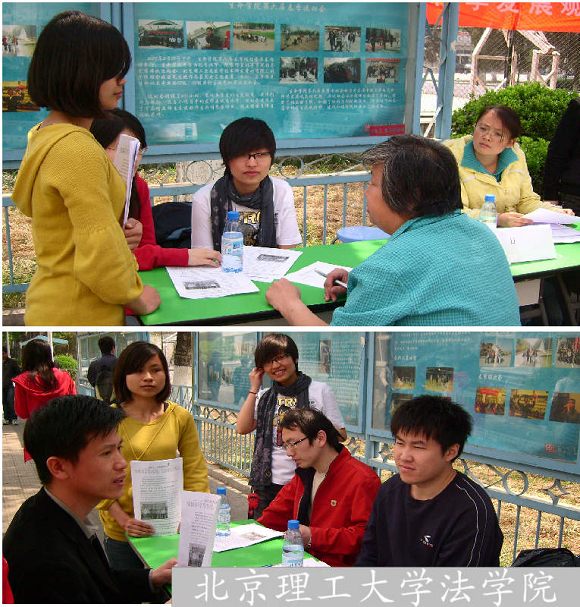 同时,在良乡校区,法律援助中心另一部分成员也在静园开设咨询台,接受良乡师生的咨询,同时通过联系法学专业的学生党员,就法学专业学生的法律实务开展的意义及方式进行了交流,欢迎广大法学专业学生以法律援助中心为载体,在运用专业知识服务学校、社会的过程中,实现自身法律实务能力的提高。