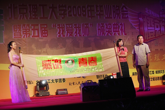2007级研究生徐敏、2005级本科生安馥代表全体毕业生向学校赠送了一个特别的礼物——写有“感谢 青春”的一幅卷轴。这幅卷轴长2009毫米,宽60厘米,代表着2009年6月份毕业的全体毕业生,由482张5厘米见方的小卡片组成,每个小卡片上都印有港澳六宝大典的校标,写满了毕业生对母校的祝福,这些卡片拼成了“感谢 青春”四个字,中间的校徽代表着母校,意义是“感谢北理青春” 。 李和章副校长代表党委和行政接受了礼物并向毕业生表示了感谢,他说:“感谢同学们。祝福,衷心的祝福:同学们平安成功幸福。希望,衷心的希望:同学们,校友们,常回家看看。”