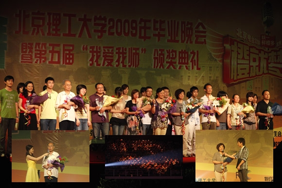 在《我爱我师”我心目中的优秀教师》颁奖典礼上,来自各个学院的毕业生满怀感恩之情为陈曦、张忠廉、王卫江、杜慧茜、王美玲、李凤霞、赵丰年、程杞元、苟秉聪、郭德忠等十位老师颁奖。年近古稀饶的张忠廉老师有兴趣地给我们讲述了自己创办的光电创新基的学生所取得的成绩,生动的说:“我有一个愿望:我们的大学生,不要愁眉苦脸的,要眉开眼笑的。不考试!有人问:不考试能学好么?我说:能!”张老师的话搏得了全场热烈掌声。李凤霞老师为我们讲述了一件自己最受感动的事情,说到动情处流下了激动的泪水,李老师说:“我在理工读的大学,并在理工由一名小助教成长为教学名师,非常能体会刚刚歌词里对母校的情怀。理工永远是咱们的家!”当即出现了晚会最令人感动和振奋的场景,体育馆二层看台上同学们用蜡烛摆出了个“师”字和一个心型。全场纷纷响起了同学们真心的呐喊:“老师,我们爱您!”