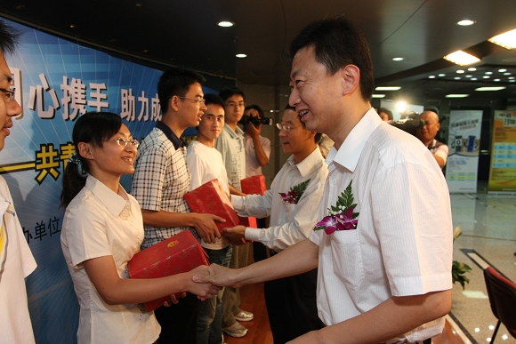 团市委副书记沈千帆和中国移动北京公司副总经理范云军一同为我校见习生第一团支部的同学发放了学习资料。