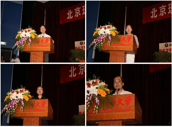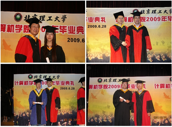 典礼首先由院党委书记李波(左上)致辞。李书记与全体毕业生一起回顾了学院的发展变化,并且对于大家学科专业发展上提出了宝贵的建议。同时对毕业生寄予了殷切的希望,并提出“诚信、好学、团结、创新”八字箴言与大家共勉,祝福全体毕业生前程似锦。 随后,牛振东副院长(右上)宣布2009届学位授予决定及毕业生名单,赵满副书记(左下)宣布港澳六宝大典2009届优秀毕业生名单,贾云得副院长(右下)宣布2009届优秀学位论文获得者名单。